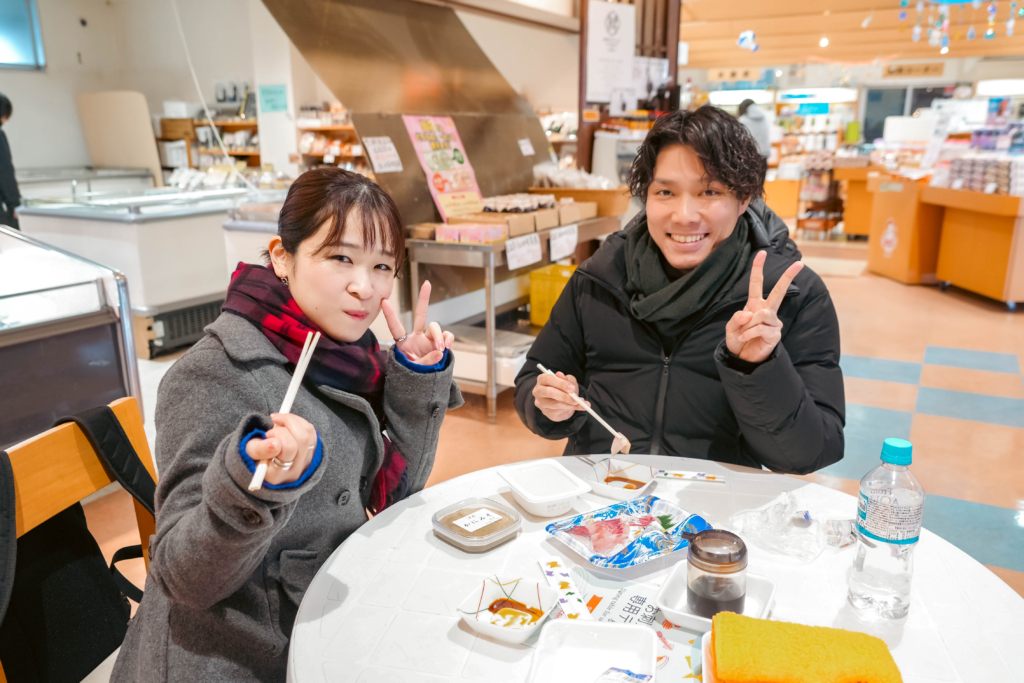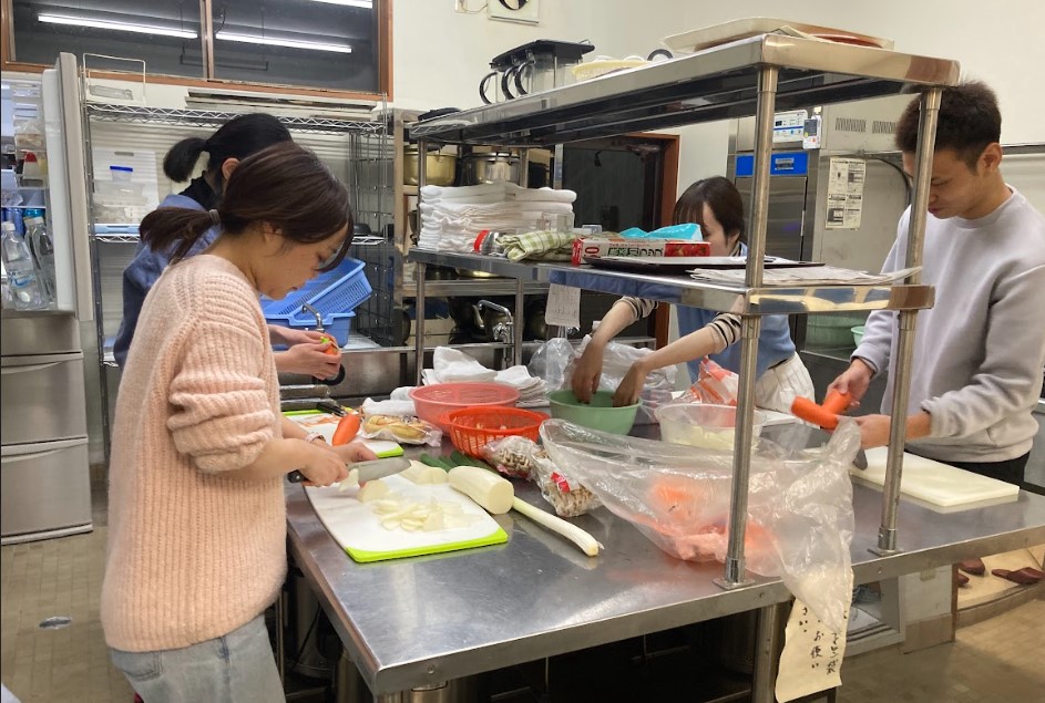 夜には参加者で地元市場の食材を使い、ふれあいハウス宮野の食堂で調理をしました。バイ貝の煮付け、具たくさんの豚汁などの自炊を通じた参加者同士の交流が、地域食材の魅力を引き立てました。