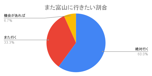 今回のイベントに参加した皆様からは、下記のアンケート結果の通り93.3%の方から「富山にまた行きたい」という意見が多く寄せられました。参加者は、イベントを通じて学びを深め、地域貢献に対する新たな視点を得ることができました。