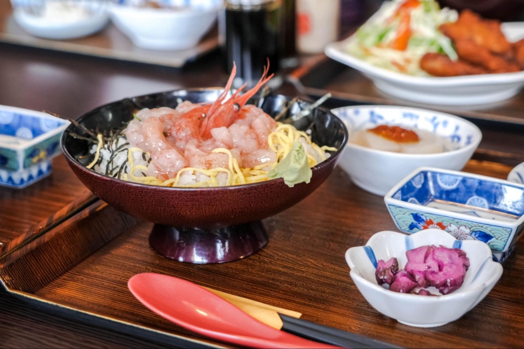 富山の魅力を象徴する「食」を通じて、地域文化や人々の生活に触れました。魚津丸食堂や道の駅蜃気楼、きときと寿司での寒ブリや甘えび丼、ベニズワイガニなどの新鮮な海鮮ランチや、加積りんごを使ったアップルパイ、富山ブラックラーメン等地元の食文化を体験しました。
